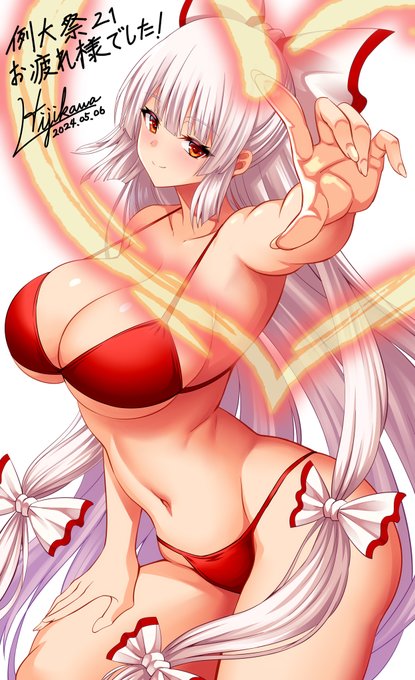 妹紅は褒められ慣れてないので、美人だスタイル抜群だと褒めちぎられた結果、気を良くしてかなり際どいマイクロビキニを着てしまうんだよね