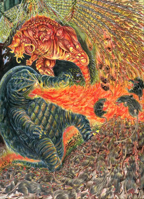 二次創作イラスト 「ガメラ対大群獣ネズラ」 手描きイラストを基にポスター風に加工しました。