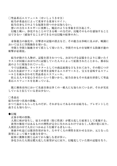 人間としての厚みを増したいので、エスフェールこと阿古屋結乃の設定への質問事項募集。 受け取った質問に対して、すでに決まっているものは回答しますし、決まってないものは設定します。 設定の都合で答えられなければ答えないだけなのでなんでもいいです。ご協力ください。