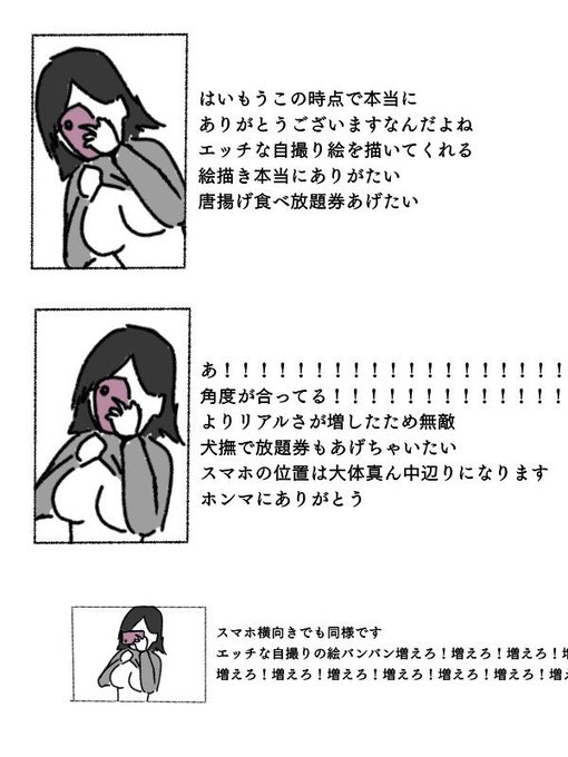 エッチな鏡自撮りの絵を描いてくれる絵描きのみなさまへ 自撮りの角度はスマホと合わせるとよりリアルになります 頭の片隅に入れておいていただけると俺がたいへん助かります よろしくお願いします インフルエンザに気をつけてあったかくして寝てください 敬具